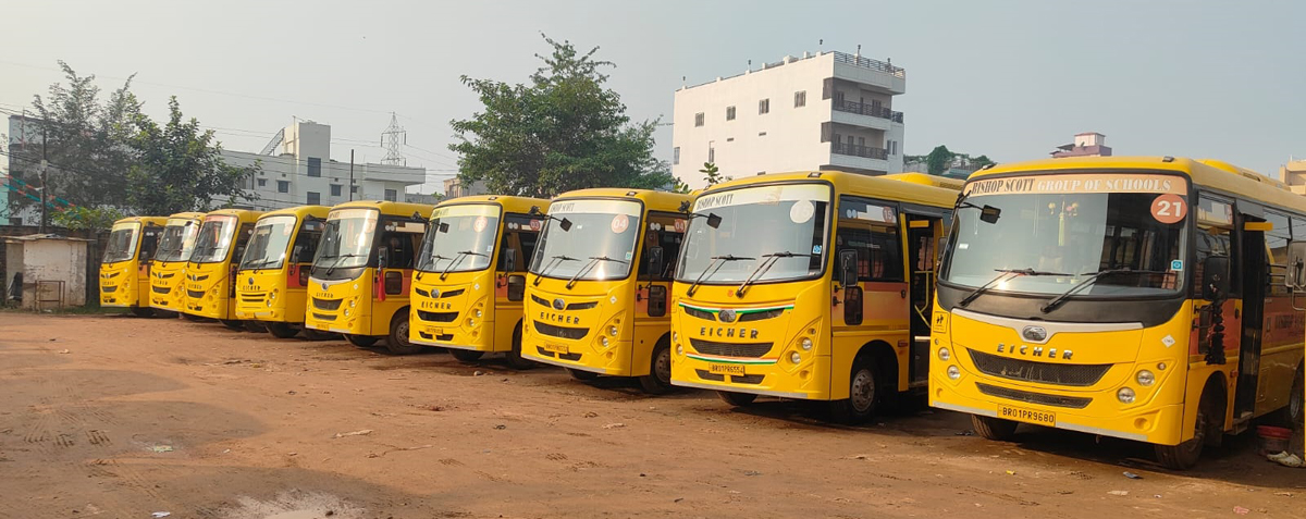 Transport is a strategic pillar for Bishop Scott and a visible part of the parent promise. The group manages roughly 110 buses and about 25 smaller vehicles. Of the bus fleet, approximately 41 units are Eicher CNG AC buses while they also have some units of Eicher CNG non-AC and diesel buses. Typical route legs run 20–25 km, and buses generally do multiple trips daily – passenger density averages 40–50 students per bus depending on route and seat configuration.