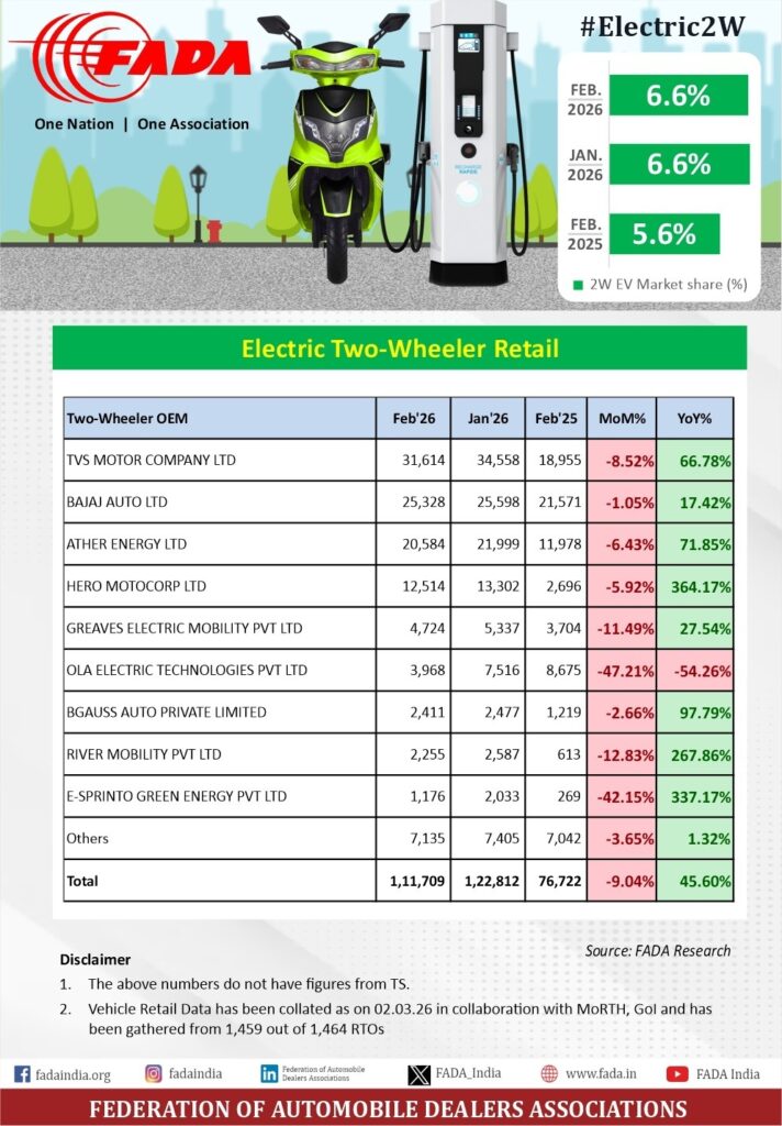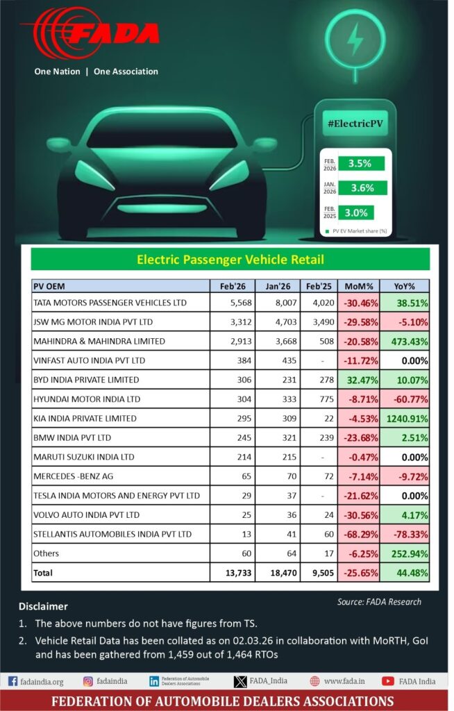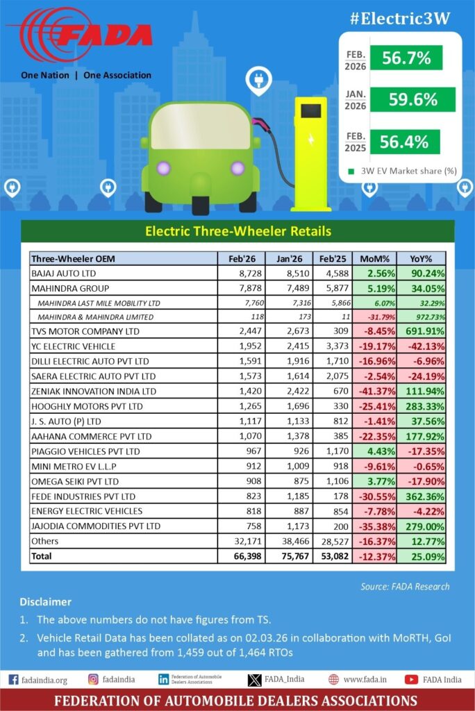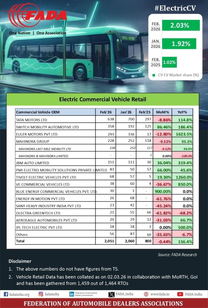 Commenting on the performance, Mr. C. S. Vigneshwar, President, FADA, said: “EV retails in February ’26 continued to grow on a year-on-year basis across categories, even as overall EV penetration remained largely range-bound due to much faster growth in ICE volumes. Electric 2W retails stood at 1,11,709 units ( +45.60% YoY ), with EV share at ~6.6%. Electric PV retails reached 13,733 units ( +44.48% YoY ), with a share of ~3.5%. Electric 3W remained the most electrified segment at 66,398 units ( +25.09% YoY ), with a share of ~56.7%. Electric CVs – though on a small base – rose to 2,051 units ( +156.4% YoY ), with share improving to ~2.03%.