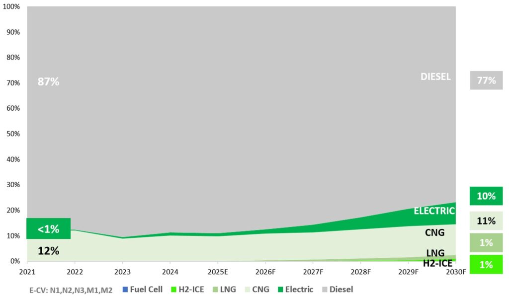 Non-ICE (electric, LNG, hydrogen) penetration remains modest and skewed to specific segments: LCVs (N1) show up to 11% EV penetration by end-decade, mainly in urban last-mile applications. Larger CVs (N2, N3) show just 4% non-ICE penetration, driven more by trials and Fleet-led procurement than market pull. LNG, Hydrogen ICE, and retro fitments remain in experimental or policy-vague zones. OEMs are exploring retro fitment, but concerns around safety, TCO, residual value, and regulatory clarity are slowing mainstream plans.