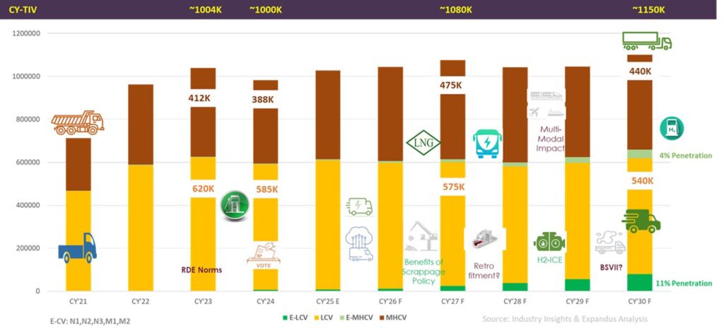 Indian CV industry is entering a Multi-Year, Moderate Growth Phase—one that’s not marked by the steep V-shaped recoveries or sharp cyclic declines of the past, but rather moderate and multi-year expansion supported by structural triggers. Total Industry Volume (TIV) is poised to cross 1.15 million units by end-decade, growing steadily from the ~1-million-unit mark. This is led not by sheer first-time purchases, but replacement demand from ageing fleets, infrastructure-led tipper/haulage demand, and bus modernization programs (especially in state transport and intercity fleet upgrades).