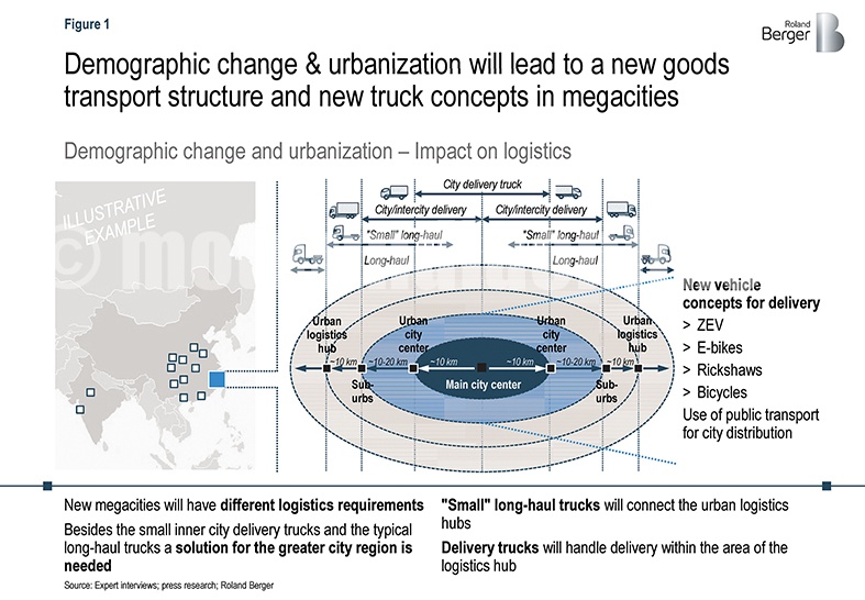 Urbanization in India is expected to increase from a current level of 31.2% (as per 2011 census) to 40.8% in 2030. In particular, mega-cities like Mumbai, Delhi, Bangalore and developing centers such as Pune will face challenges and will need new logistics concepts. For example, Delhi is among the world’s most densely populated cities. While the city itself is dominated by the tertiary sector, it is surrounded by several large industrial areas with intensive manufacturing activities. Currently, these major industrial areas in NCR are connected to the rest of the country via national highways that pass through the heart of Delhi creating unnecessary truck traffic within the city boundaries. Going forward, we can imagine a network of peripheral expressways that connect major industrial areas and bypass Delhi. Corresponding logistics concepts would see a hierarchy of logistics hubs around the city which are served not only by small inner city delivery trucks and typical long-haul trucks but also by “small” long-haul trucks as shown in Figure 1. This would open up volume and product opportunities for Indian OEMs.