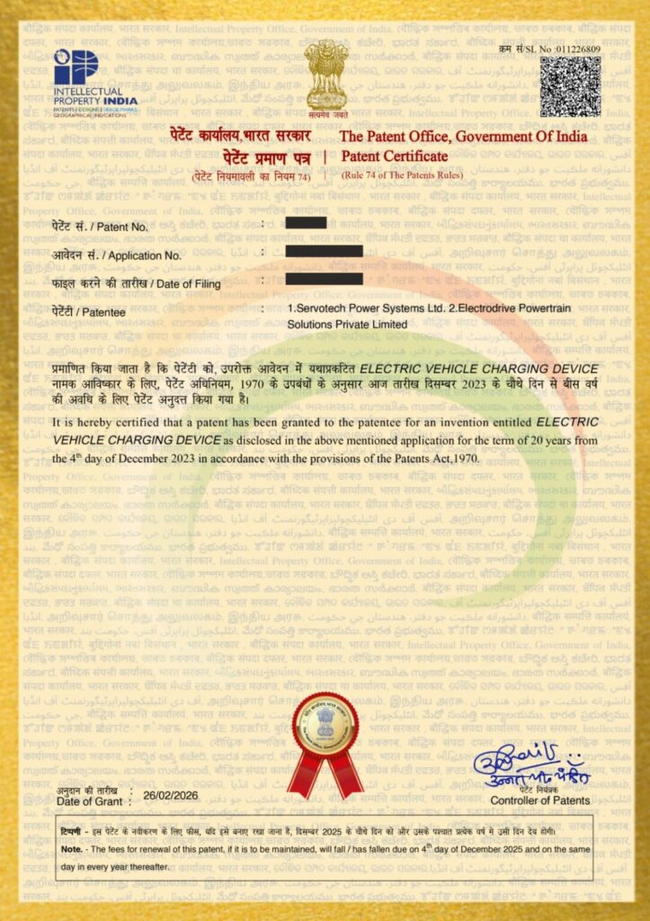 Servotech Renewable Power System Ltd., in collaboration with Electra EV, has secured a patent from the Indian Patent Office for an innovative electric vehicle charging device designed specifically for low-voltage EV platforms.