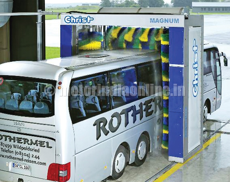 The bus wash machine made of aluminum has a galvanized finished main frame, high-density wash brush, high-speed drive motor controls, anti-tilt system and robustly engineered high pressure jet stream system designed to clean intricate surface areas and the varied profiles of buses in India.