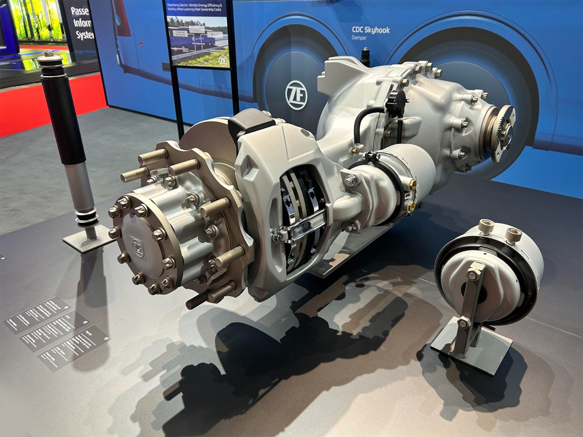 ZF premiered a new generation of axles for next-generation bus and coach platforms, including the A134 axle, which reduces weight and improves recuperation capacity while maintaining existing installation points. The new AV134 electric portal axle provides 20 percent higher torque capacity and 4 percent lower energy consumption than its predecessor, with production planned for 2027.